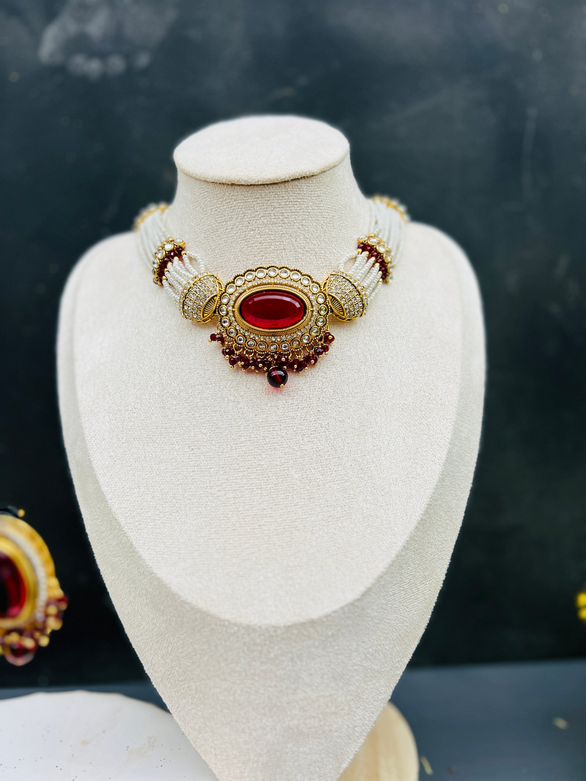 Add a bold touch of elegance to your look with this kundan necklace set  with pearls and bead detailing. A statement piece perfect for bridal wear, festive celebrations, and special occasions