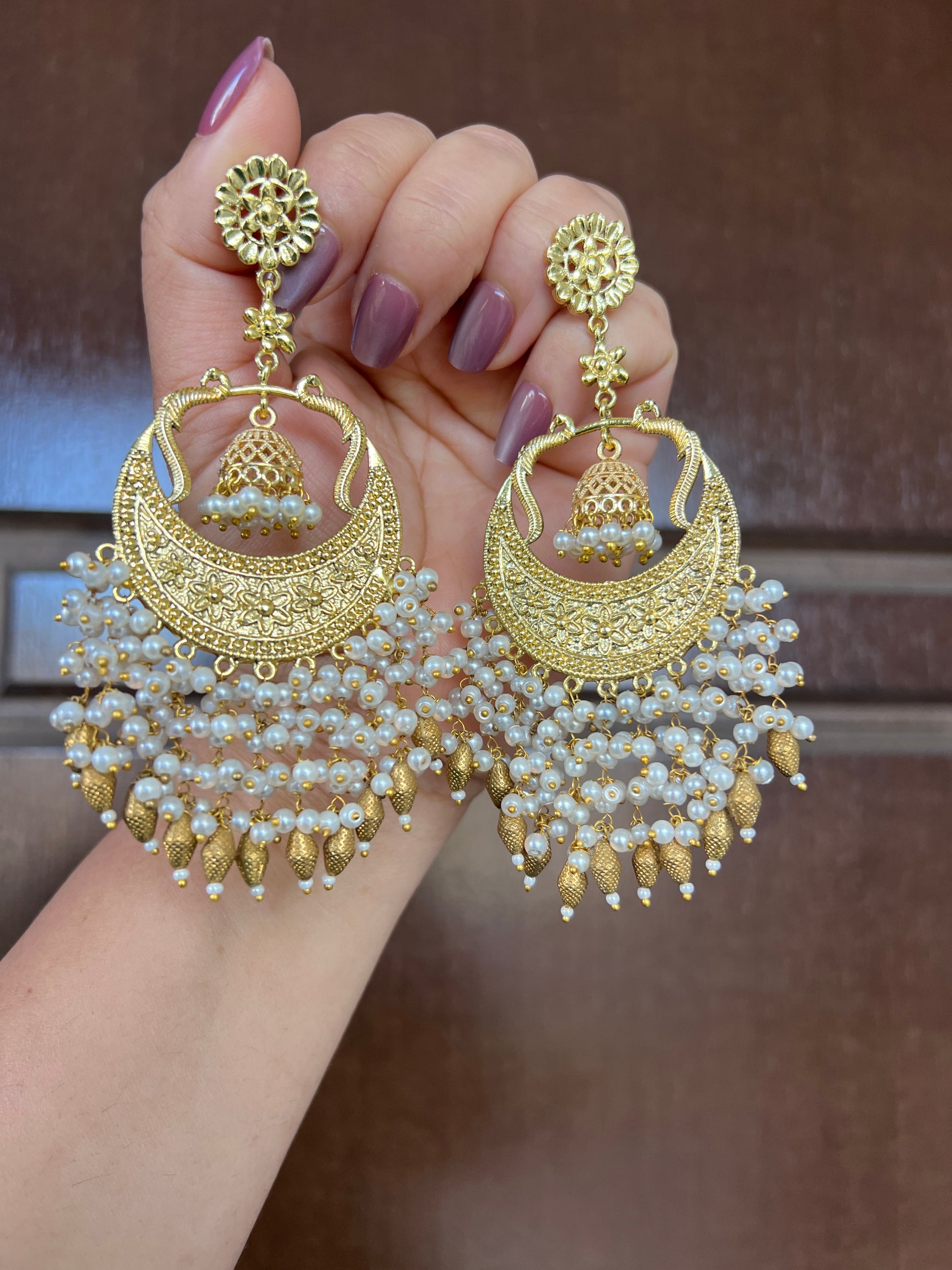 Statement gold tone earrings stunned with baby perls and golden beads drop earrings
