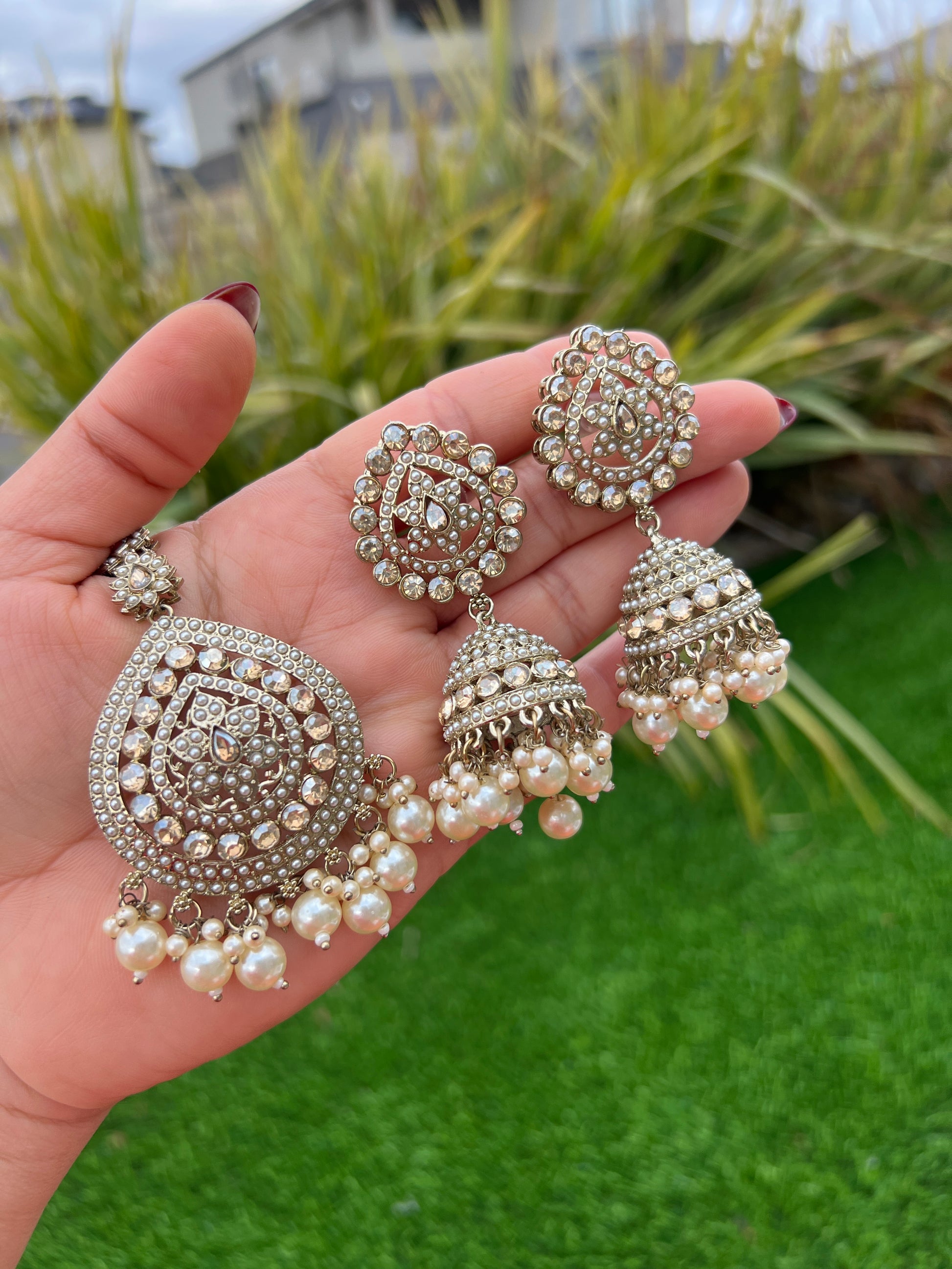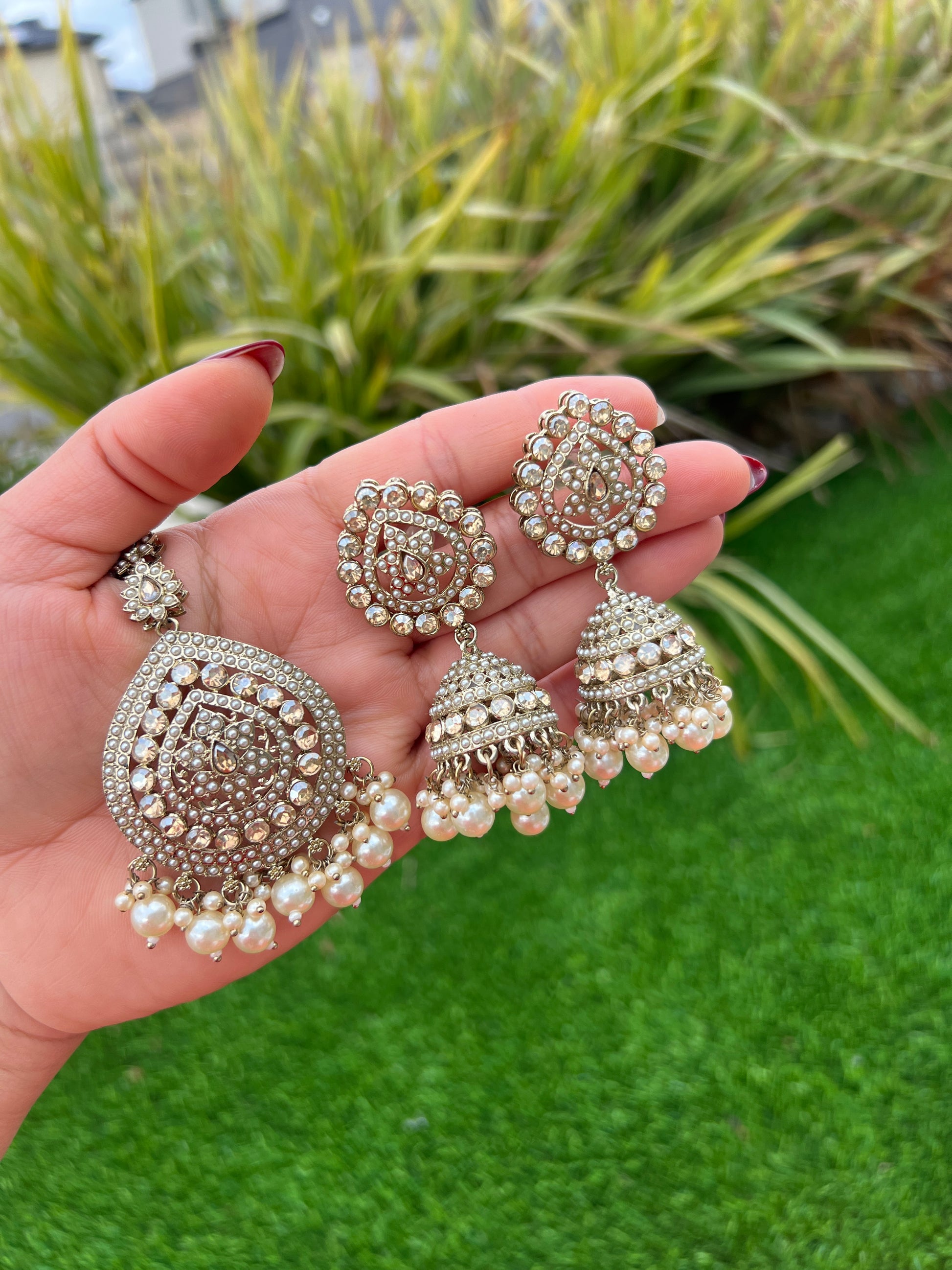 The antique Gold Tone jhumka and Tikka set is a vibrant and elegant piece studded with a variety of simulated Polki, faux pearls, and coloured stones.