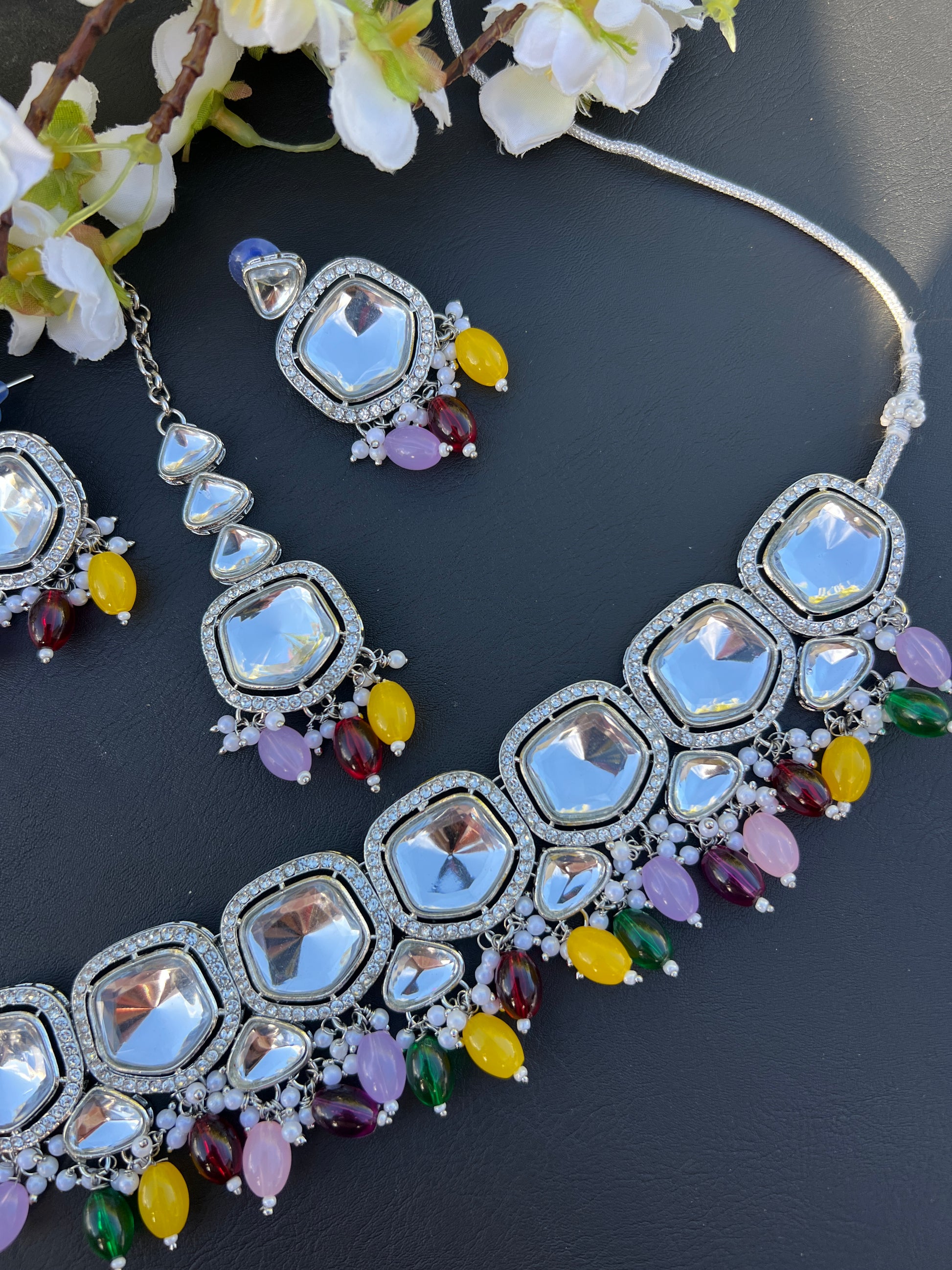 Presenting stunning silver tone kundan and zercon necklace with faux pearls along with beautiful earrings and maang tikka