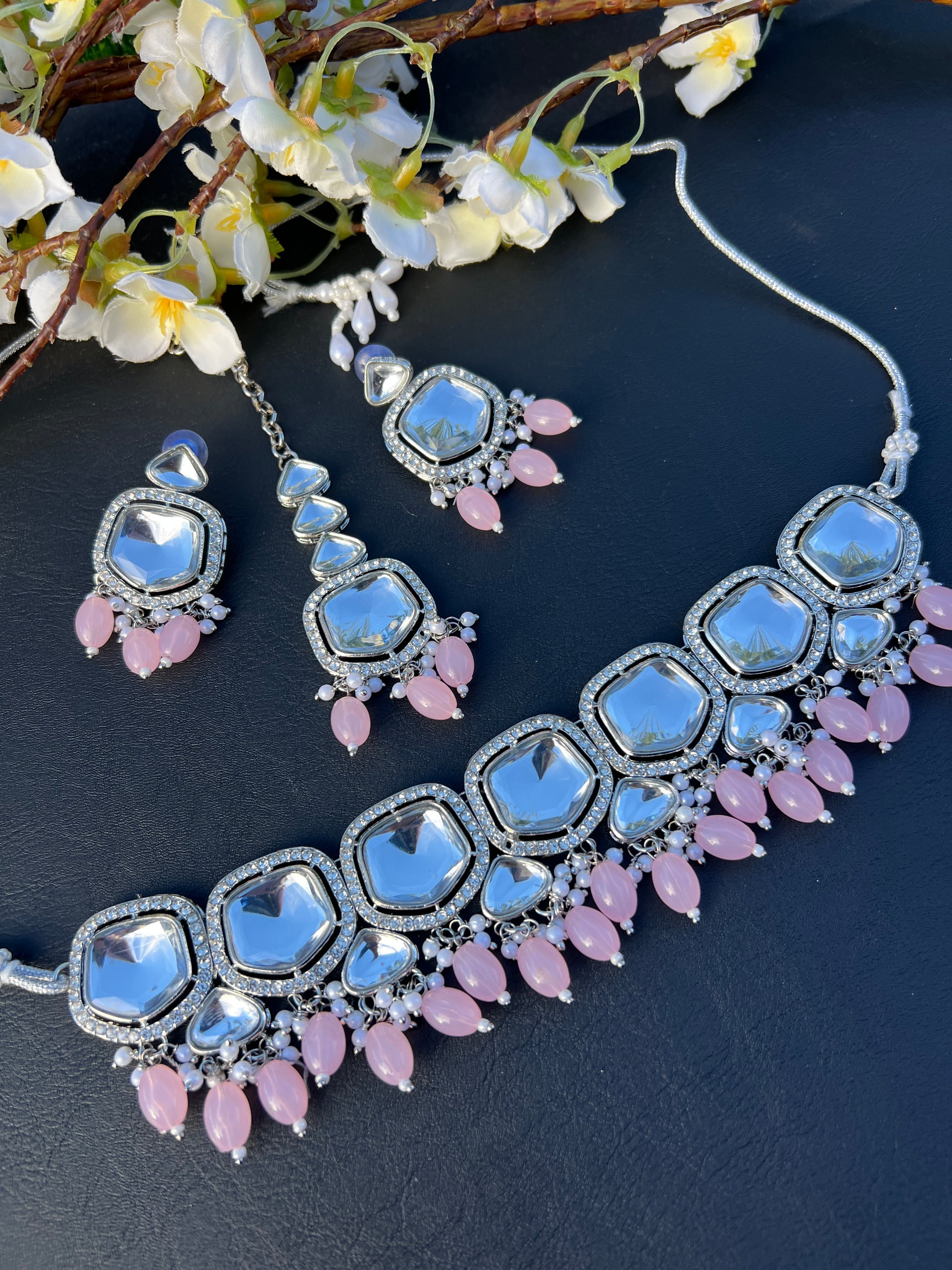 Presenting stunning silver tone kundan and zercon necklace with faux pearls along with beautiful earrings and maang tikka