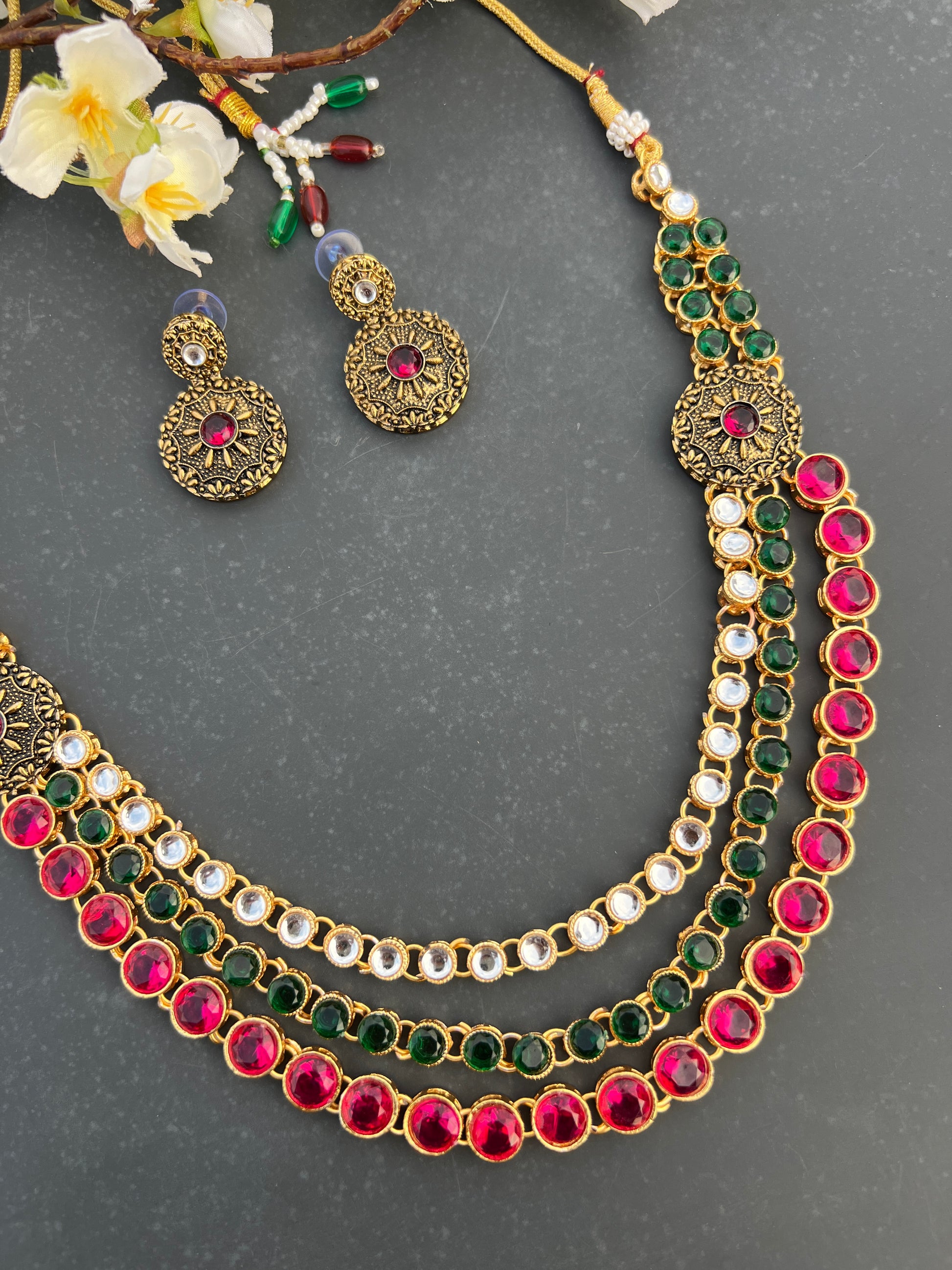 Introducing our antique Gold look 3 Layered Necklace, adorned with simulated kundans, . Crafted on a base of high-grade alloy metal, this necklace combines traditional craftsmanship with modern design, creating a statement piece that enhances your grace and style.