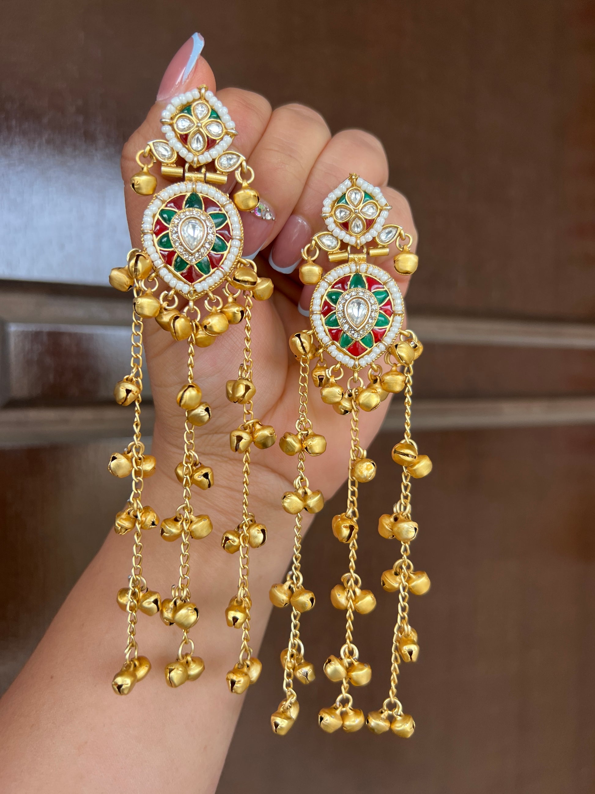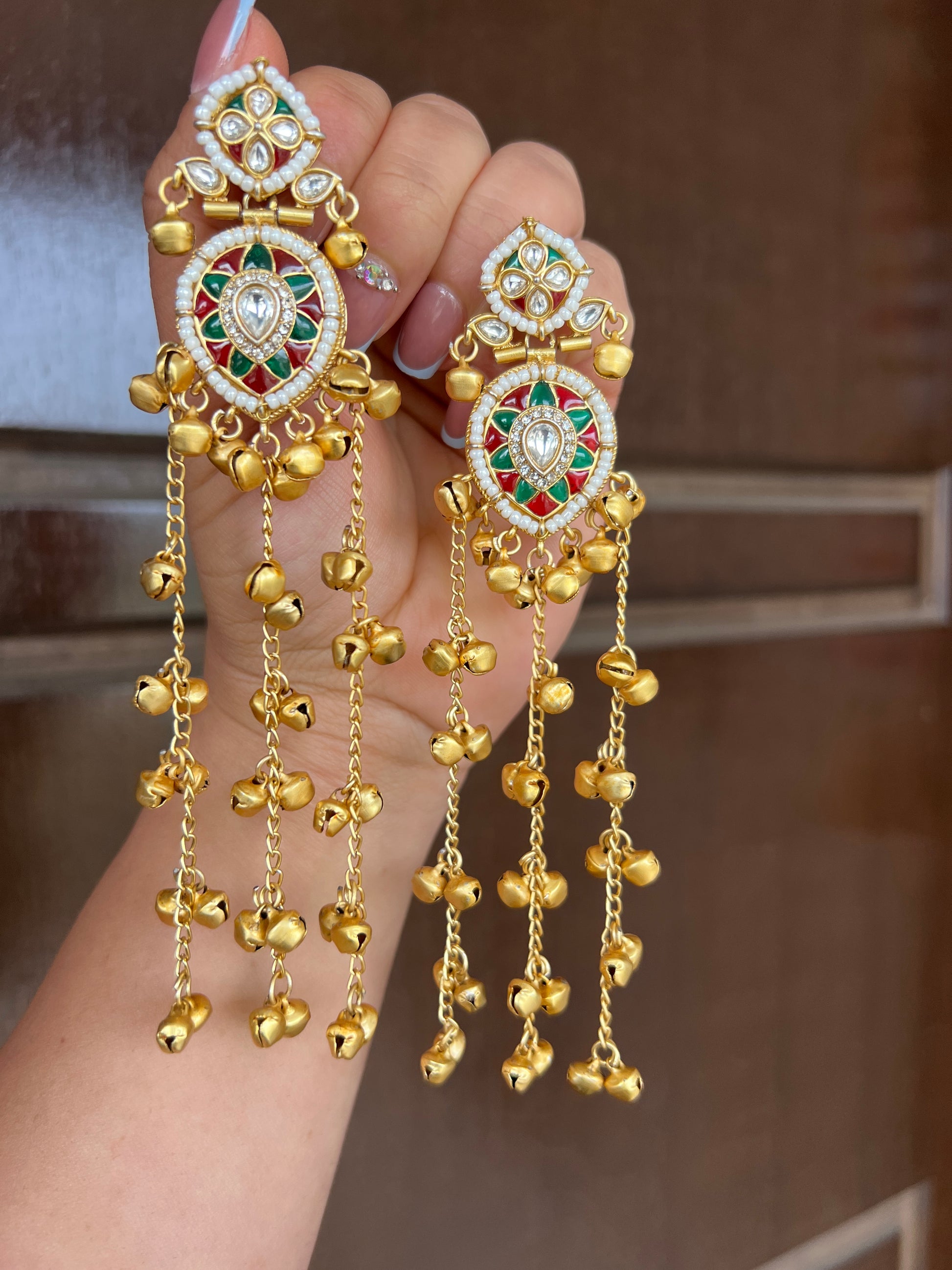 Stunning kundan Kashmiri earrings with dangling ghoongaroo beads which makes them more magical, this beauty is exactly light weight which makes them most comfortable to wear.