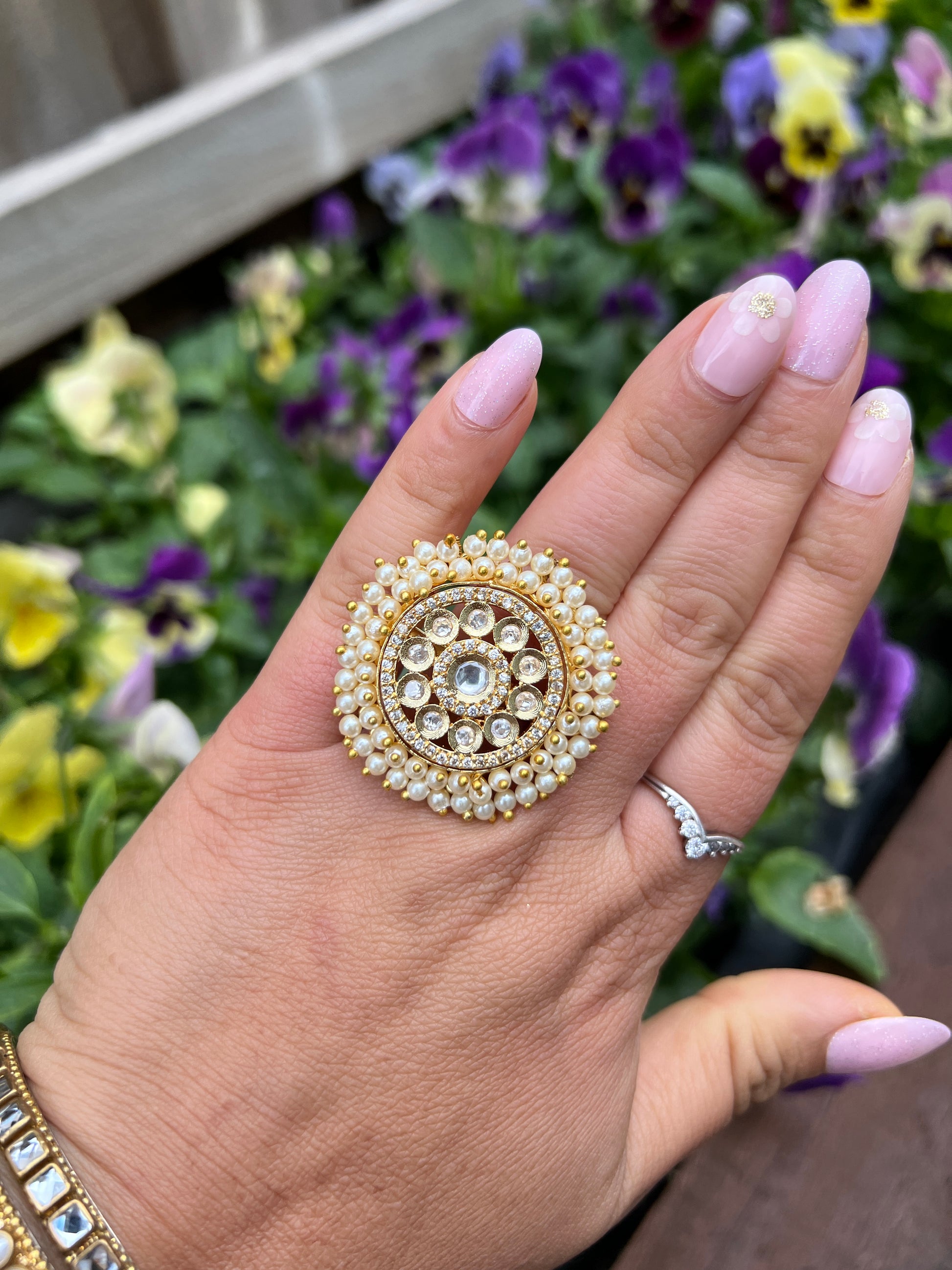 Beautiful uncut kundan large adjustable ring adorned with baby petal beads