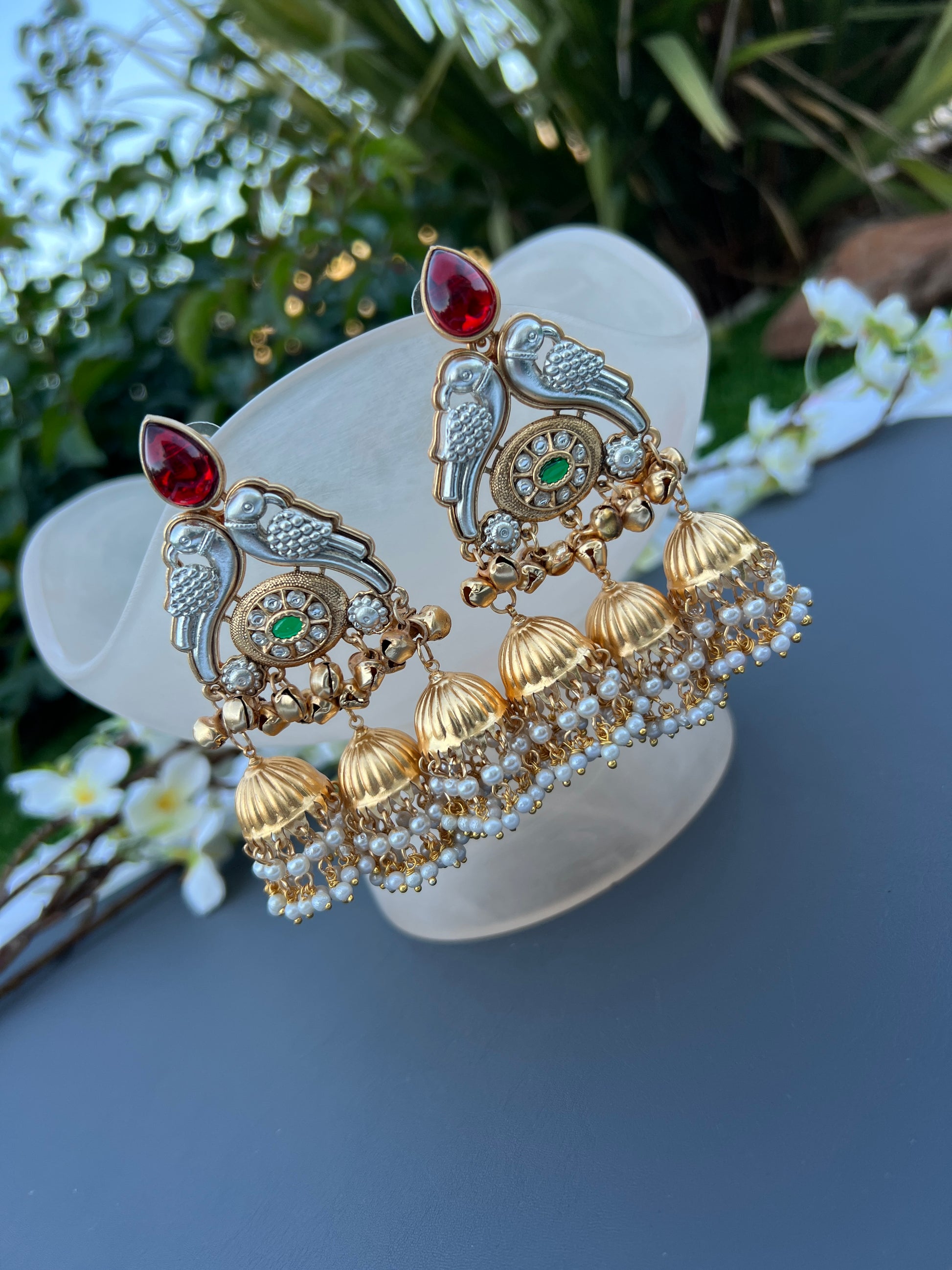 Make a majestic statement with our ""Nayab "" Two Tone Kashmiri earrings, designed to embody the richness of Indian heritage. These earrings are adorned with radiant maroon and green stones, kundan accents, and a beautifully crafted dome-shaped jhumka. Delicate faux pearls and golden ghungroos dance with every movement, adding an ethereal charm and soft melody to the design. Crafted from premium alloy, Perfect for weddings, festive events, or cultural celebrations, the Siyara earrings are a celebration of craftsmanship, tradition, and timeless beauty.