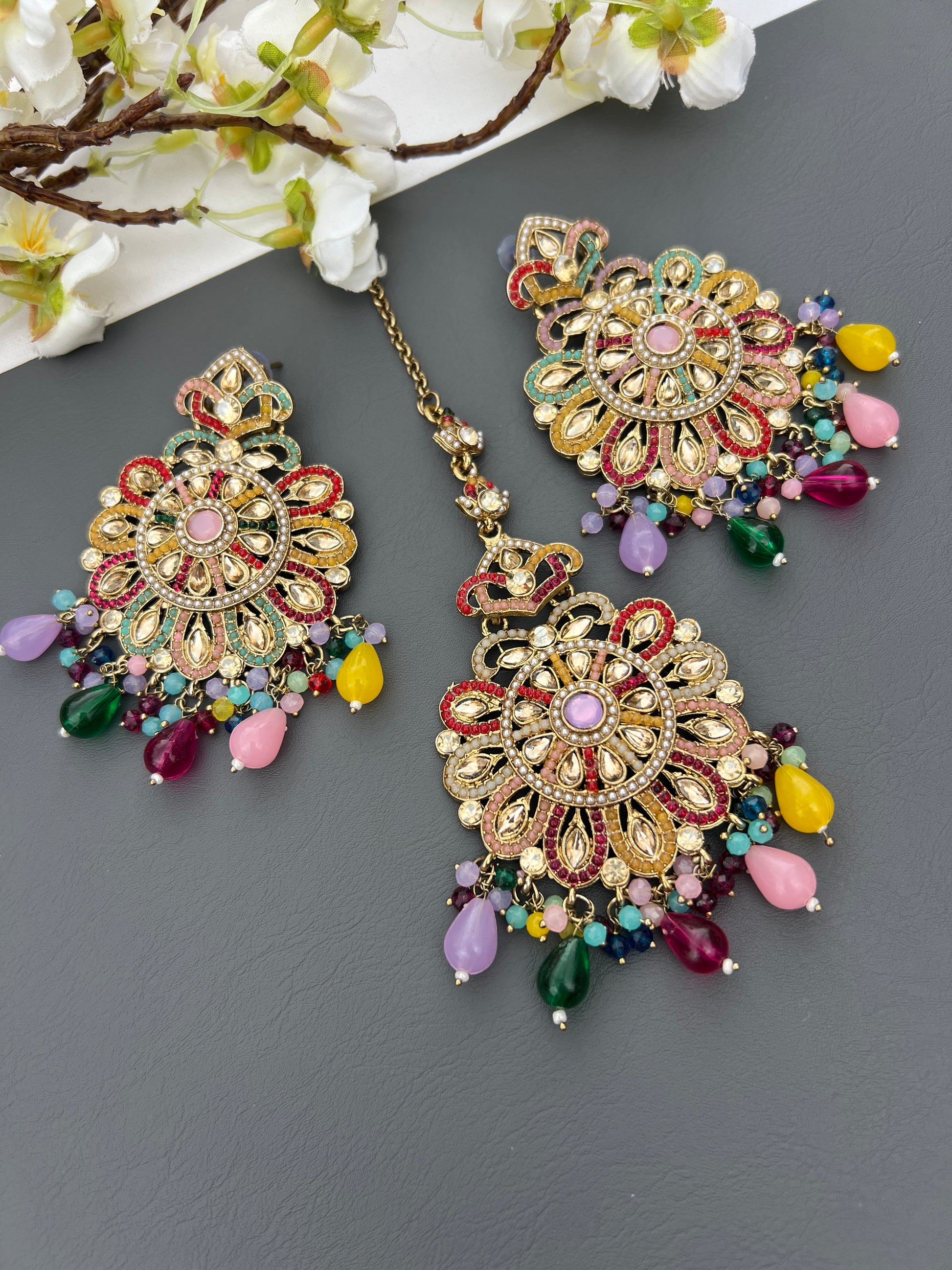 The an Gold Tone oversized earrings and Tikka set is a vibrant and elegant piece studded with a variety of simulated Polki, faux pearls, and coloured stones.
