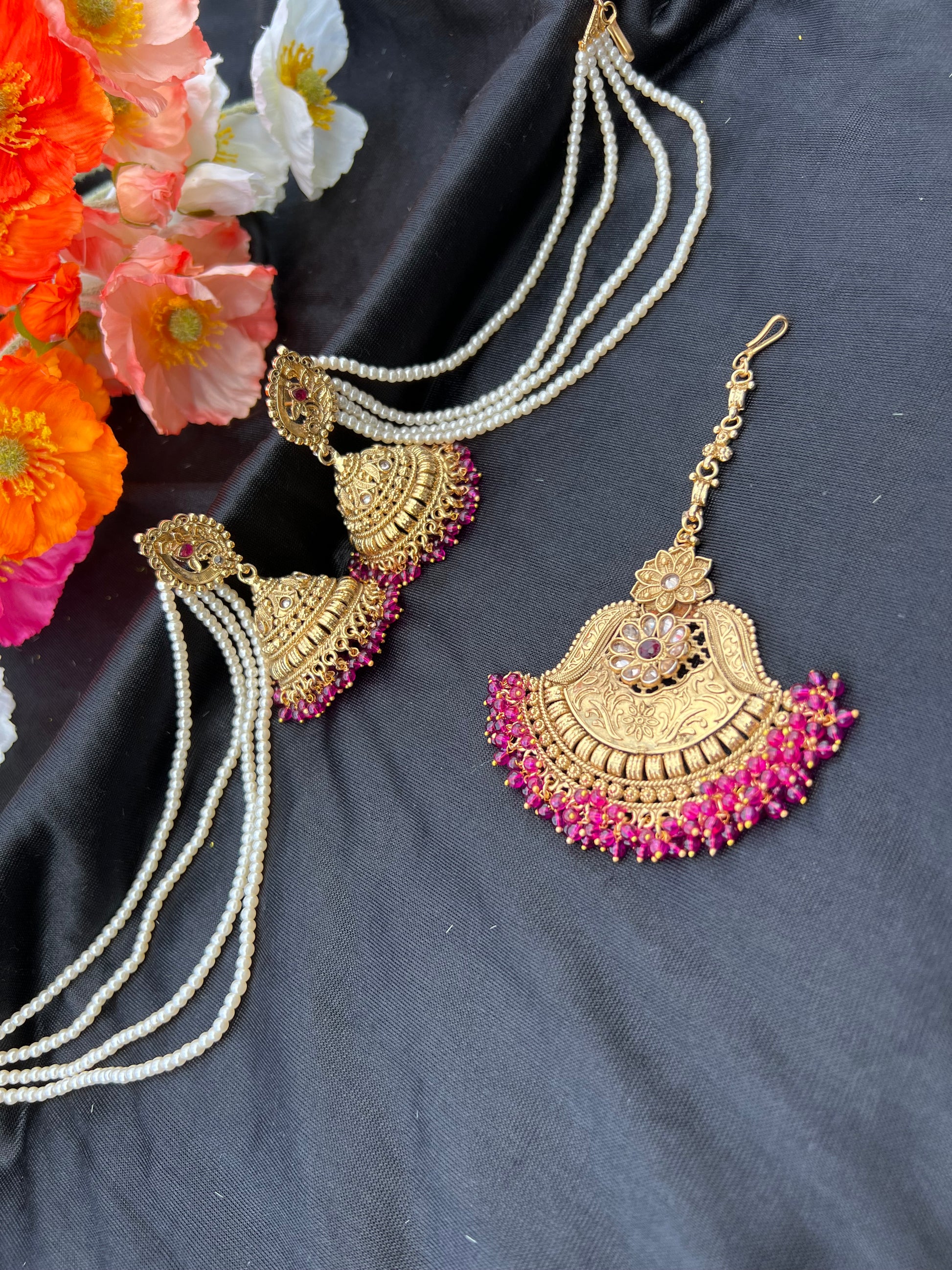 Presenting high quality gold plated oversized tikka with beautiful jhumka along with baby pearls ear chains. A perfect piece for jaggo and sangeet function.