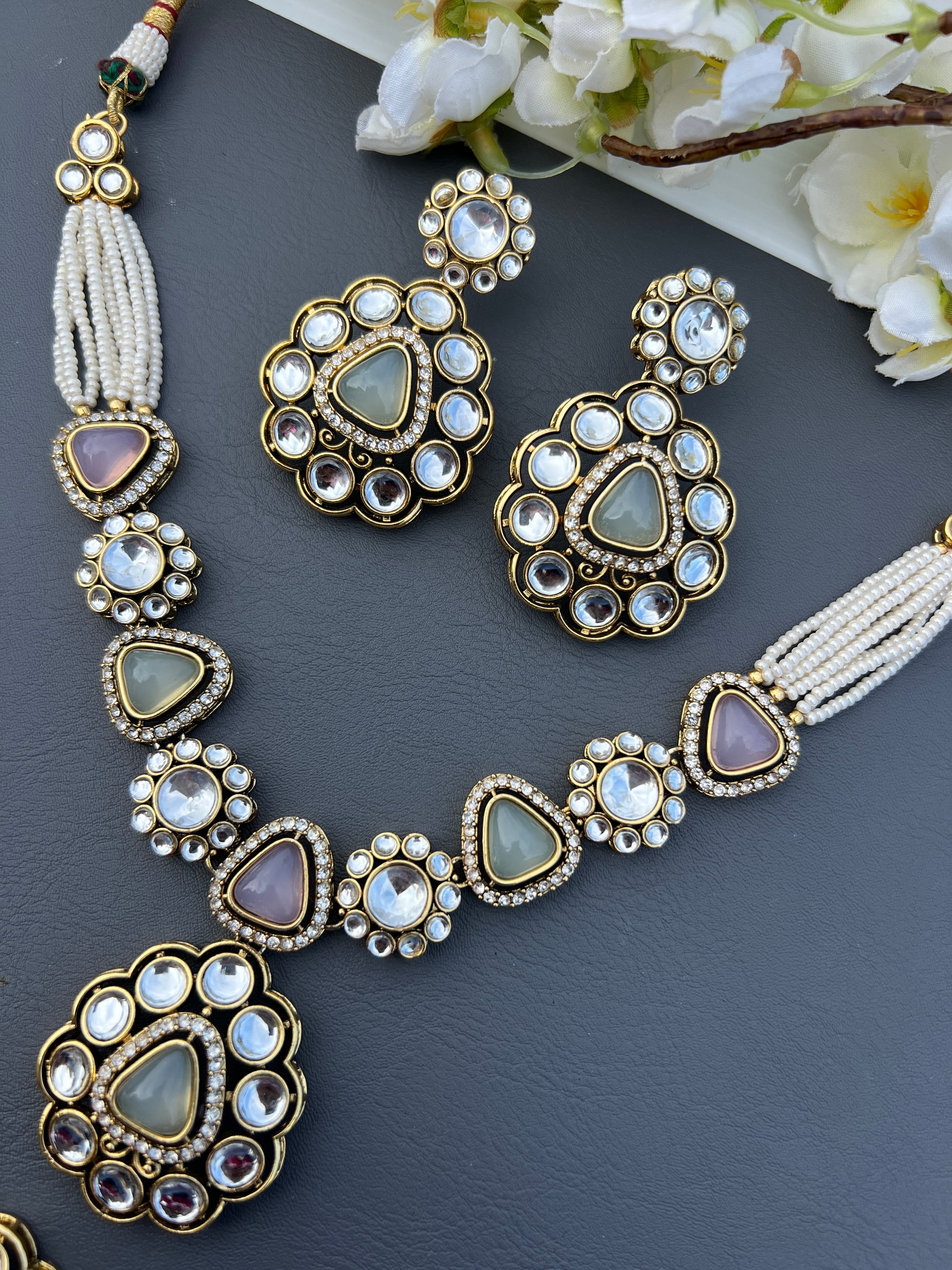 Elevate your ethnic ensemble with this exquisite Gold-Tone Necklace Set, a timeless piece designed for the modern woman who embraces tradition. Meticulously crafted with intricate detailing, this luxurious set showcases a regal blend of high-grade alloy metal, simulated Polki diamonds, sparkling CZs, multicolor stones, faux pearls, and dangling beads—all working in harmony to exude royal charm.
