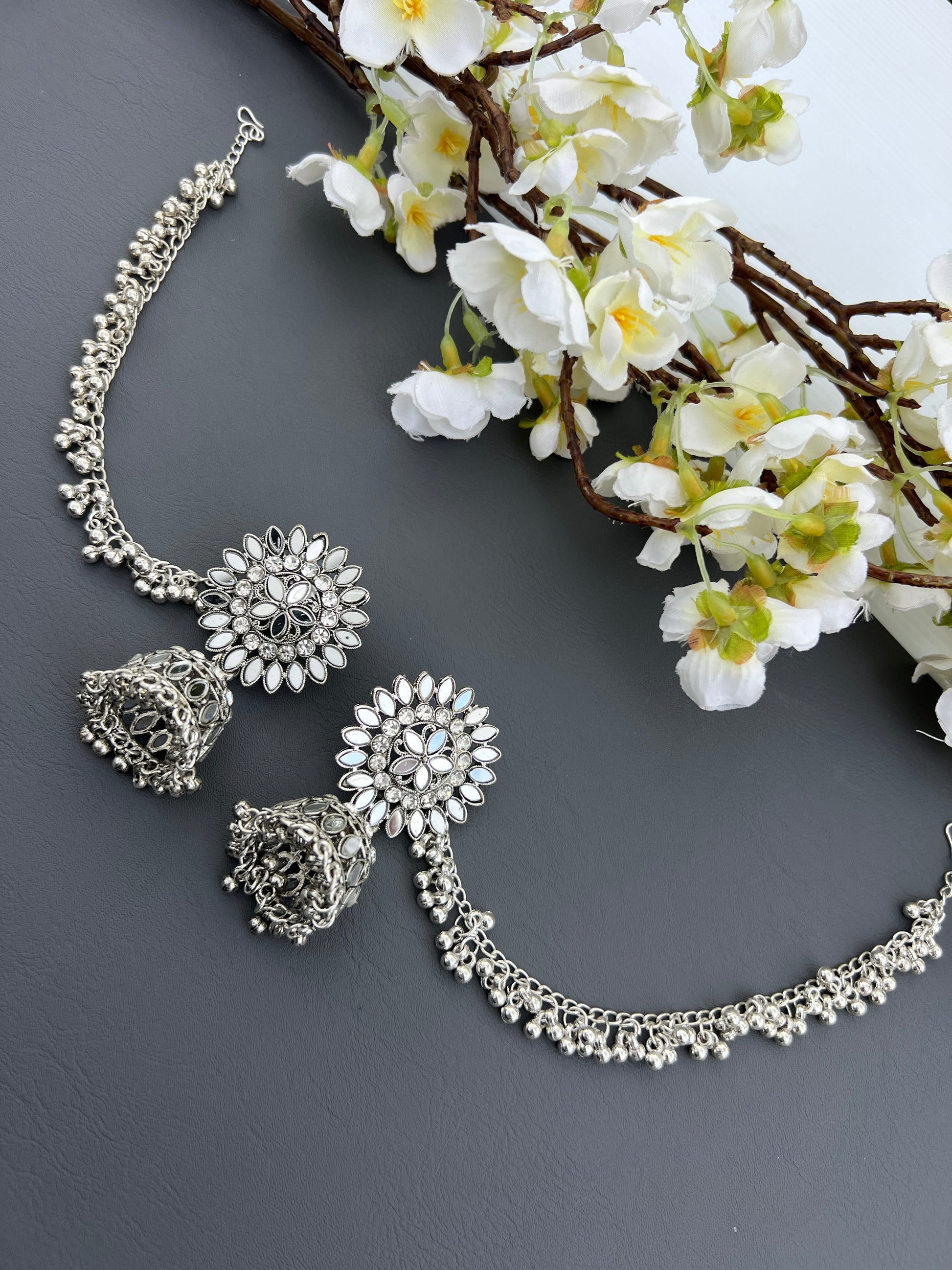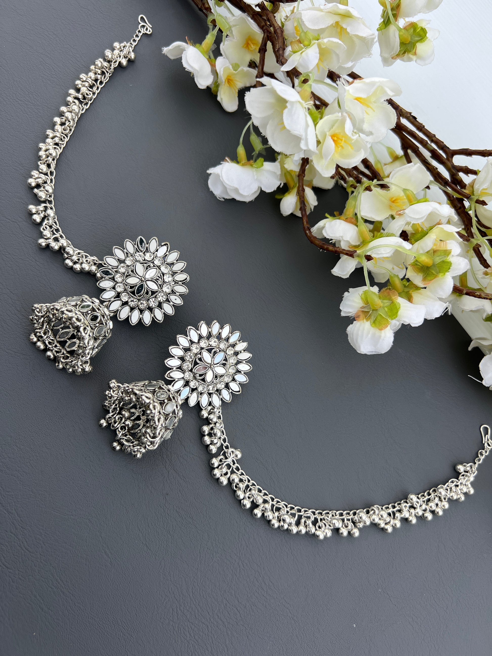 Beautiful oxidise silver jhumka adorned with mirror work along with detachable ear chains