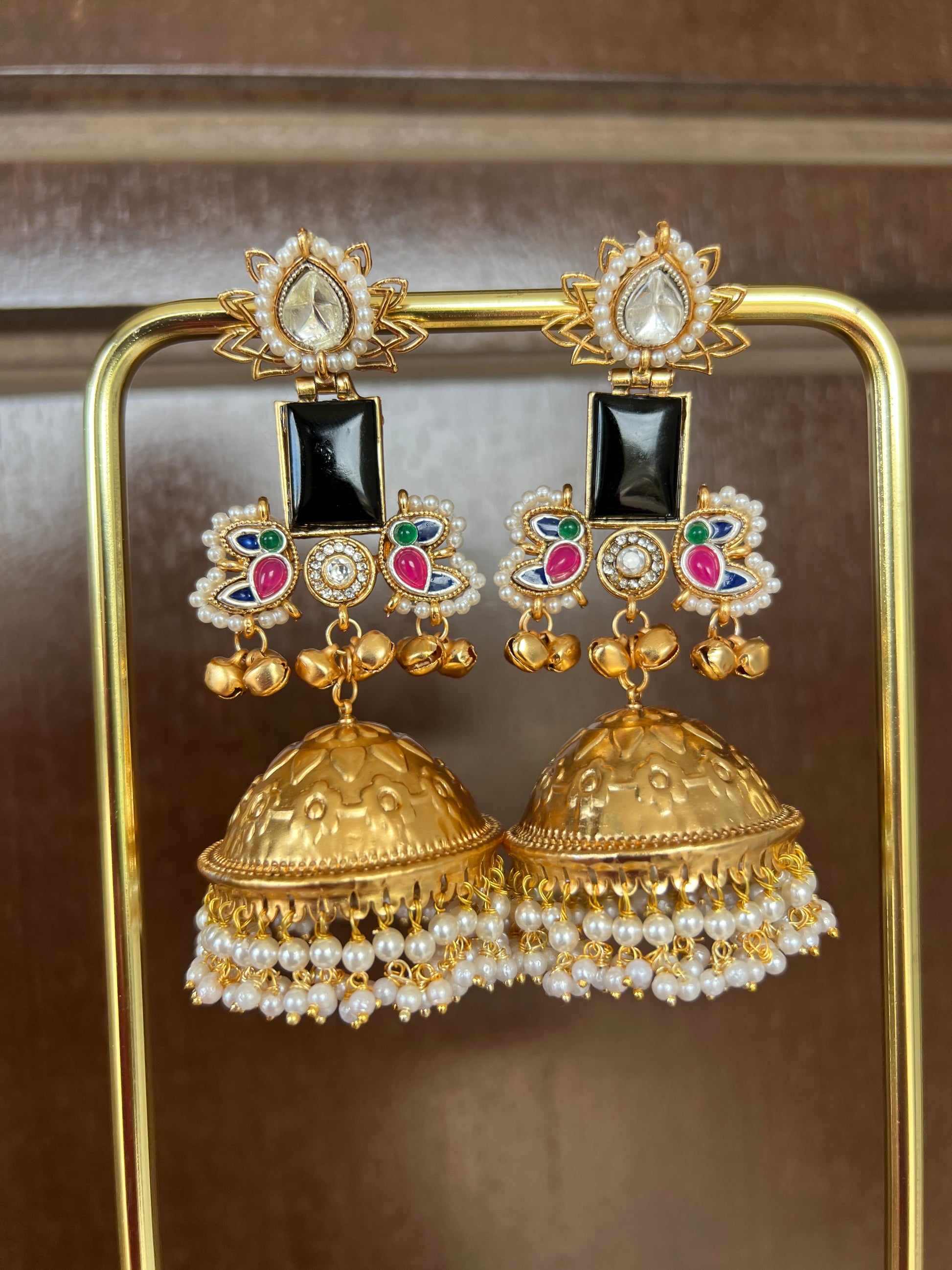 Introducing the Sreeja Jhumki large Earrings – a true masterpiece that brings together elegance and tradition. These exquisite jhumkas are adorned with Simulated black, green and rubi, enhancing their radiant beauty. The design is further elevated by delicate Ghungroos and pearls, creating a playful yet sophisticated charm. Handcrafted with precision, these earrings reflect a unique Mughal-inspired design, offering a timeless blend of artistry and luxury. Crafted from durable alloy metal, they are finished with a lavish gold plating, exuding a sense of refined grace. Perfect for festivals, weddings, or any special occasion, these earrings add a touch of regal elegance to any outfit, making them a must-have accessory for those who appreciate beauty and craftsmanship.