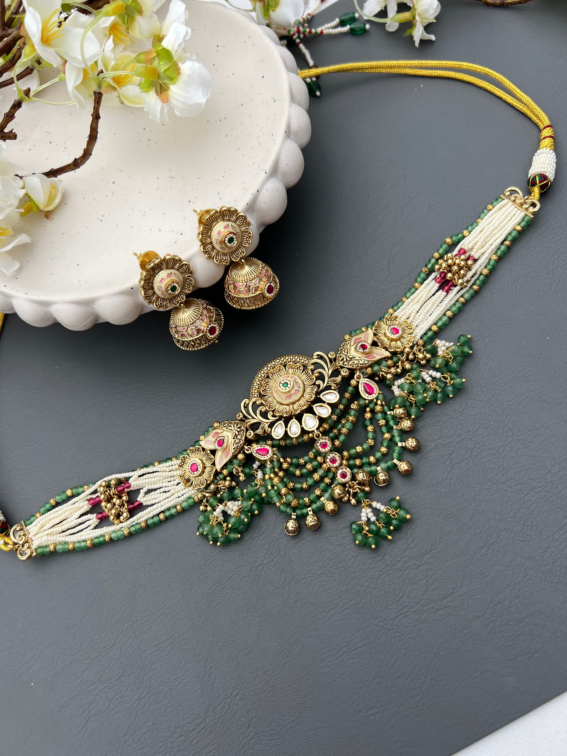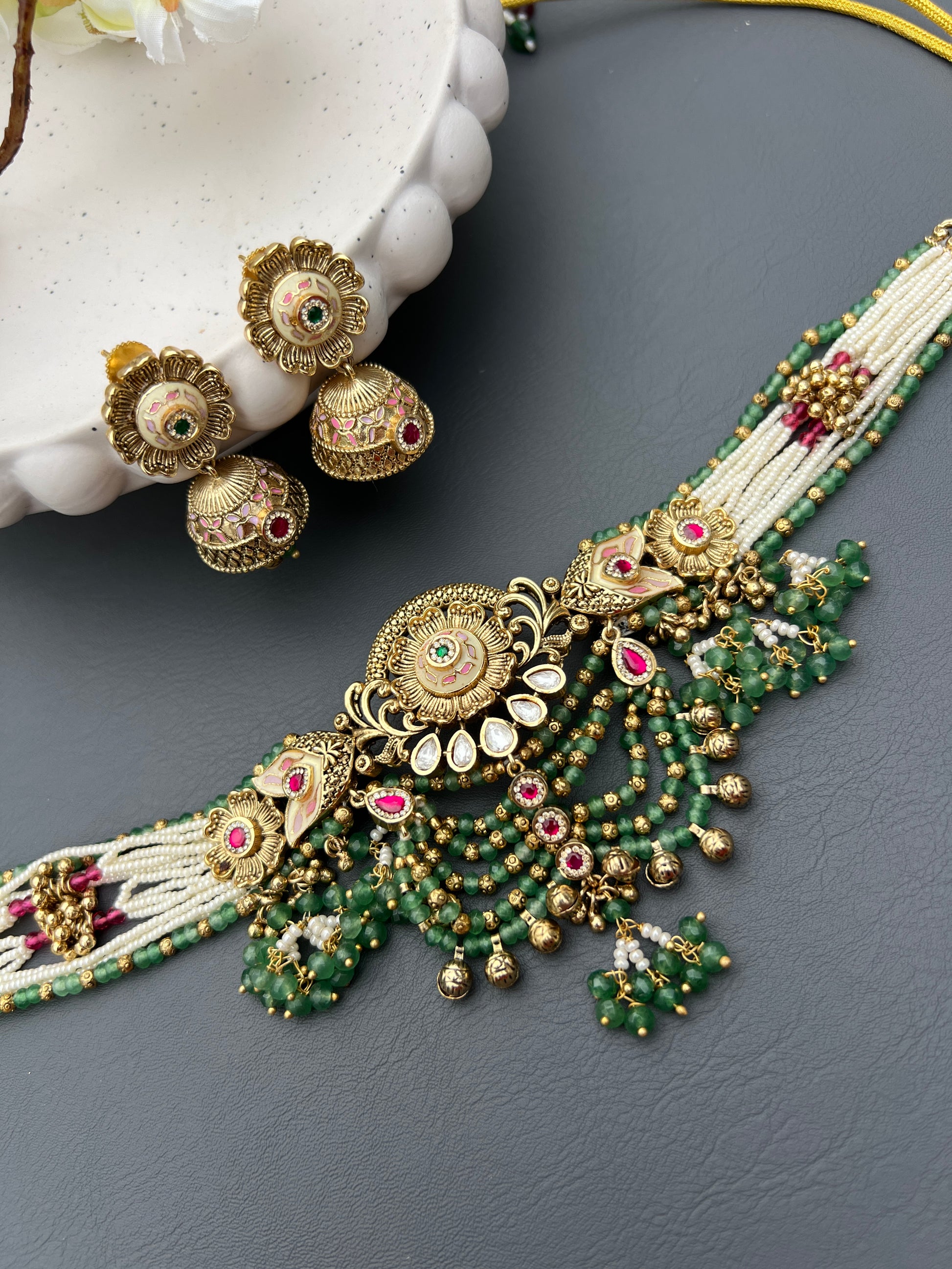 Next to real gold plated choker set with small jhumkis crafted with tyani kundan and adored with American diamond work around and stunned with high quality enamel work , this choker set seamlessly combines traditional elements with modern design. The simulated Kundans, vibrant stones, faux pearls, and mint green beads create a rich and elegant aesthetic. The adjustable cord ensures a comfortable fit, making it suitable for various neck sizes. The matching earrings complete the set, making it an ideal choice for adding a touch of glamour to your ensemble.
