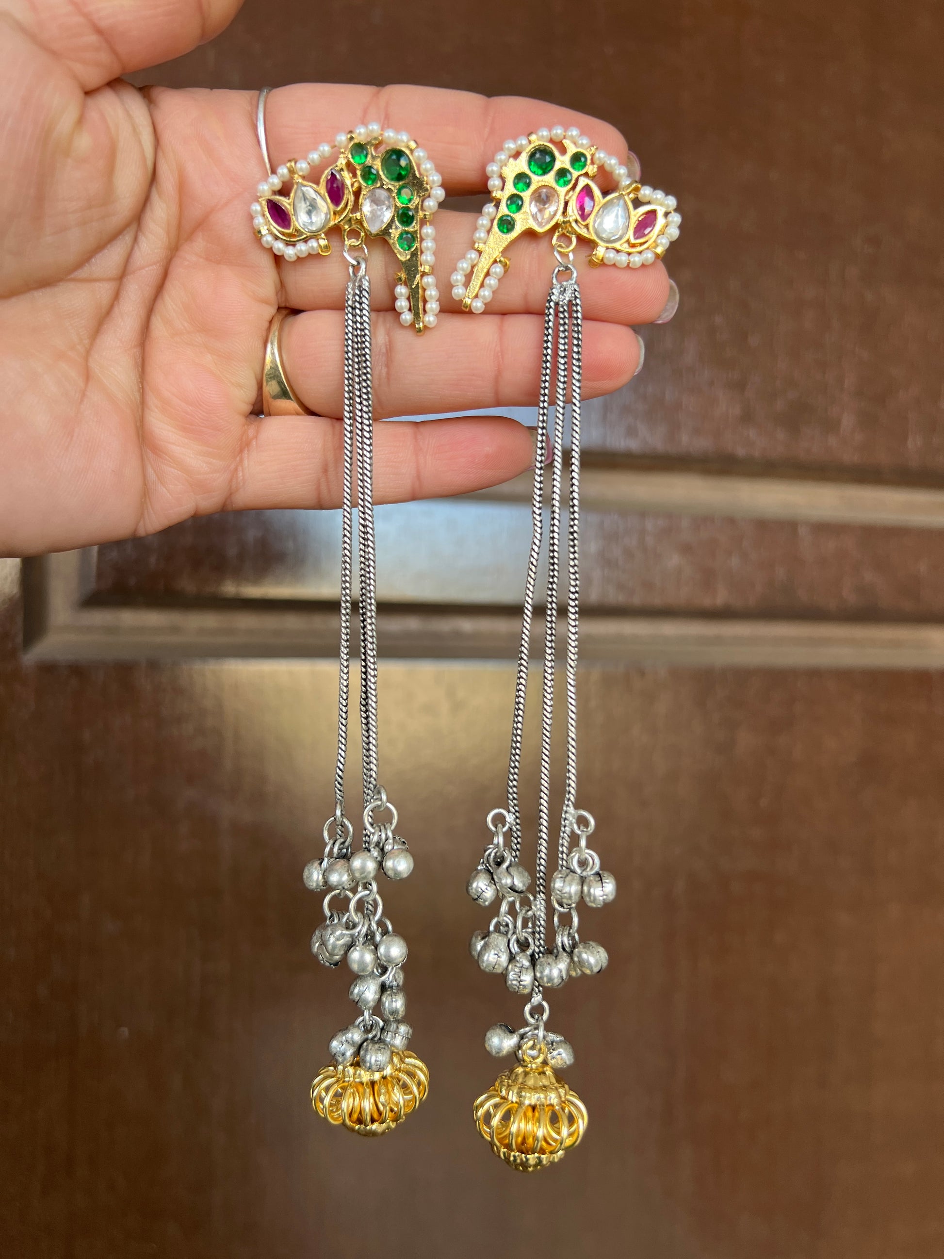 Presenting our timeless Varnika Dual tone Long Jhumki Earrings—a perfect harmony of tradition and elegance. Handcrafted in high-quality alloy metal with a radiant dual finish, these statement earrings showcase a charming parrot motif at the top, highlighted with colorful sparkling stones. Cascading silver chains with golden beads and a lotus-inspired centerpiece flow gracefully into traditional dome-shaped jhumkis, adorned with delicate pearl hangings. Completed with a secure post-back closure, the Varnika earrings make a stunning choice for weddings, festive occasions, and cultural celebrations.