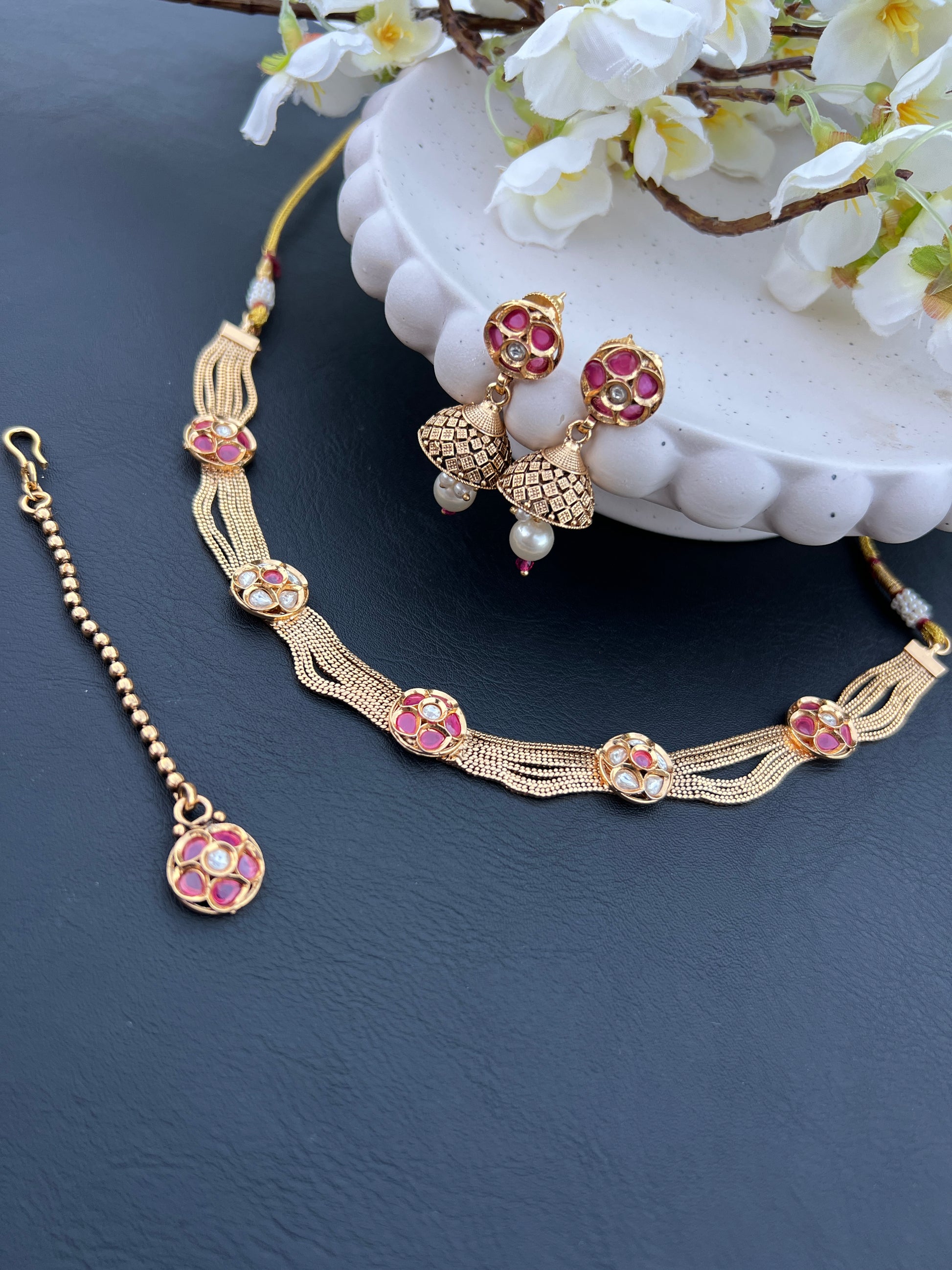 The Next to real gold plated Necklace Set. Crafted on a base of high-grade alloy metal adorned with uncut kundan. The adjustable cord ensures a comfortable fit for all neck sizes, and the matching earrings and cute small maang tikka complete the set. This set beautifully combines cultural aesthetics with contemporary style.