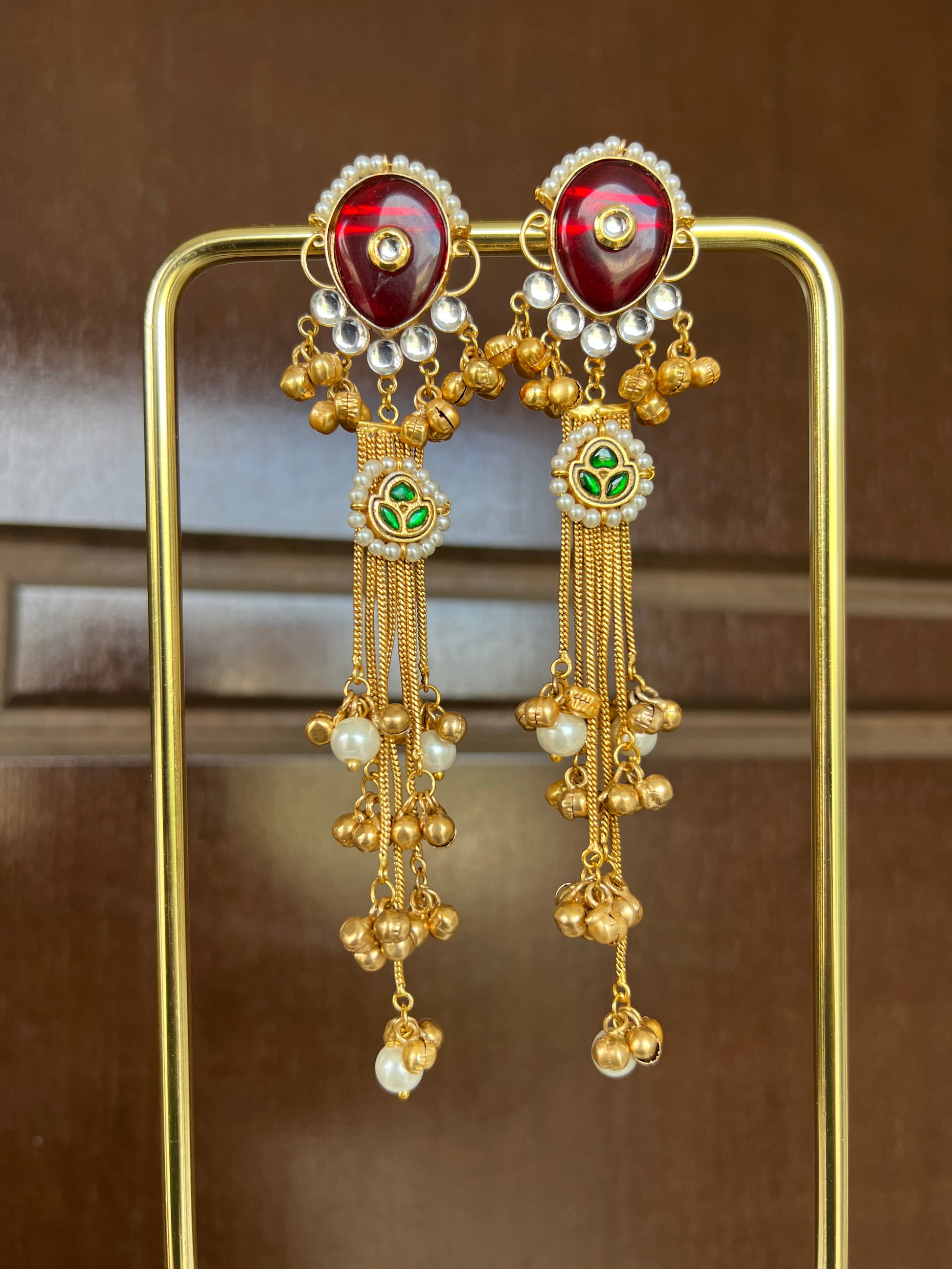 Step into timeless elegance with our yahvi dangle earrings, a tribute to the grace and grandeur of royal traditions. These exquisite earrings showcase delicately set rubi stones alongside intricate kundan craftsmanship, radiating regal charm with every detail. Delicate ghungroos add a graceful movement and a musical allure to the design. Graceful and artistic, these earrings bring a royal charm to festive outfits and elevate any ethnic ensemble with their intricate beauty.